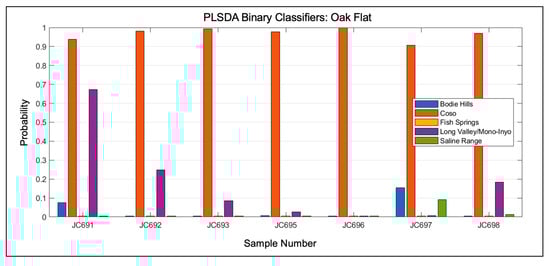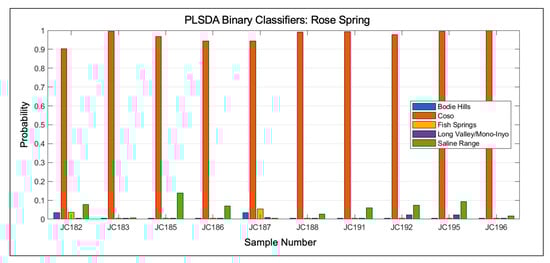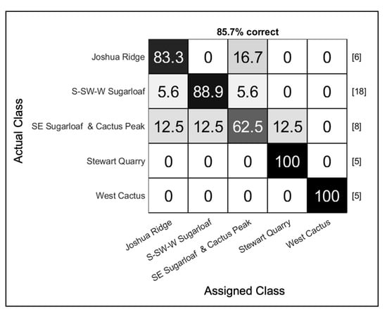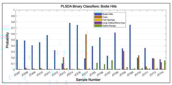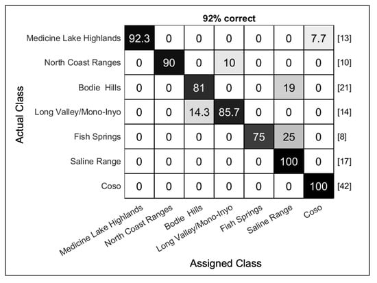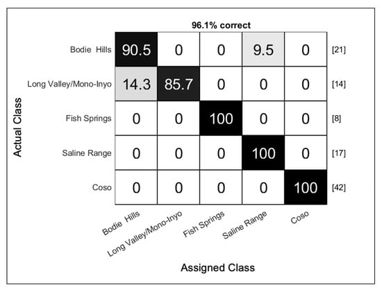 Although the number of spectra collected in this study was large, the number of samples for several of the classes was small, and a concern for small data sets is that the classification accuracy can be influenced by which samples are grouped together into each fold. For this reason, multiple iterations of k-folds were used to generate a distribution of classifier performance. For both the source discrimination and Coso sub-source discrimination, 50 iterations were used to estimate the classifier performance distribution. Five-fold cross-validation was used for the source discrimination, but the number of folds was reduced to three for the Coso sub-source discrimination due to the small number of samples for some of the sub-sources.