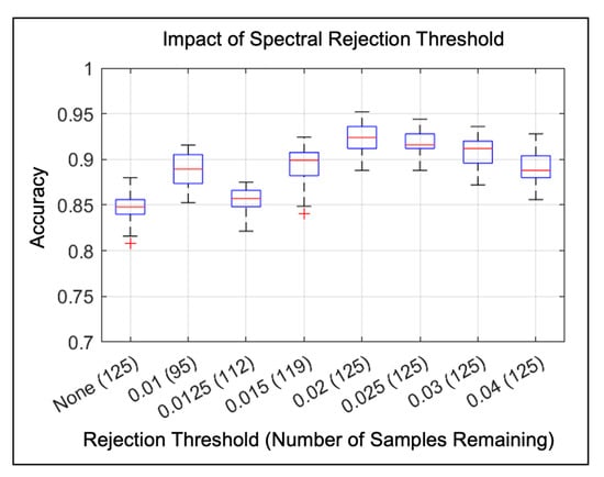 The first stage of data preprocessing of acquired LIBS spectra consisted of two parts: baseline correction and Ar line removal. Baseline correction consisted of first estimating the baseline (i.e., the portion of the spectrum that is not informative) and subtracting it from the original spectrum. The baseline was estimated by first using a Hampel filter [] to remove any strong emission line magnitudes. The Hampel filter uses a sliding window in which the data surrounding an emission line is used to calculate the median absolute deviation (MAD). If the magnitude of the emission line is greater than a factor of the MAD (factor = 3 for this study), the magnitude is replaced with the MAD. The sliding window size used for the Hampel filter was 2% of the spectrum length.