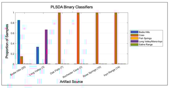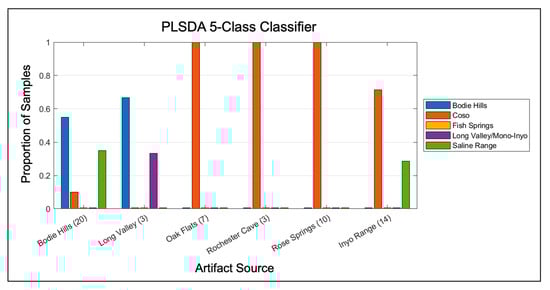 Overall, 28.6% of the spectra that were collected for this study were rejected. With this spectra rejection technique, it is possible to remove entire samples from the data set if all the pieces’ spectra from a sample of obsidian are rejected; however, using this threshold did not result in any sample removal. Table 2 lists the percentage of samples, pieces, and spectra that were rejected by class. Spectral rejection was spread somewhat unevenly across the classes: 40.6% for Fish Springs, 37.3% for the Medicine Lake Highlands, 34.1% for Bodie Hills, 33.9% for the North Coast Ranges, 32.3% for Long Valley/Mono-Inyo, 30.0% for the Saline Range, and 15.9% for Coso (Table 2).