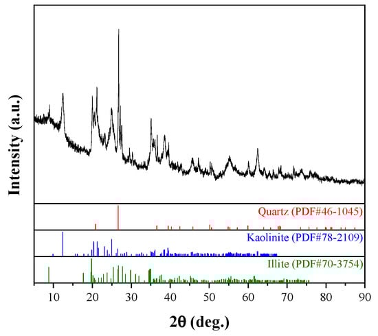 Reagent-grade ammonium formate (Sinopharm Chemical Reagent Co., Ltd., Shanghai, China) was used as a leaching aid. Reagent-grade ammonium chloride and ammonium sulfate (Sinopharm Chemical Reagent Co., Ltd.) were used as leaching agents, while reagent-grade ethanol and silane coupling agents (Sinopharm Chemical Reagent Co., Ltd.) were used to modify clay minerals. The WREO samples used in this study were from Jiangxi Province, China. The ore samples were dried and ground to obtain particles that all passed through a 200-mesh molecular sieve to ensure the mean diameter of the particles was less than 200 mesh. The ore samples were analyzed by X-ray diffraction, as shown in Figure 1.