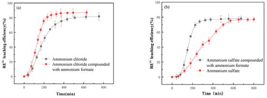 RE3+ leaching efficiency as a function of time. (a) Ammonium chloride system; (b) ammonium sulfate system.