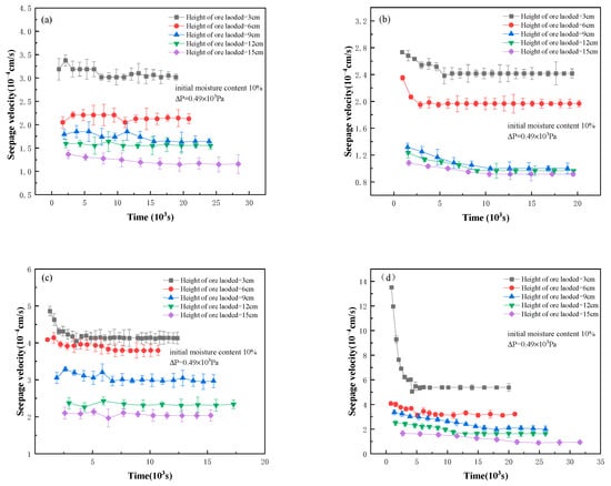 For the condition of 10% initial moisture content and 0.49 × 103 Pa differential pressure, the change curves of seepage velocity with time for different loading heights are shown in Figure 3. The effects of ammonium formate on the seepage process for the ammonium chloride system and ammonium sulfate system are shown in Table 1 and Table 2.