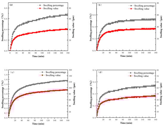Swelling percentage and swelling value in different solutions as a function of time. (a) Ammonium chloride; (b) ammonium chloride compounded with ammonium formate; (c) ammonium sulfate; (d) ammonium sulfate compounded with ammonium formate.