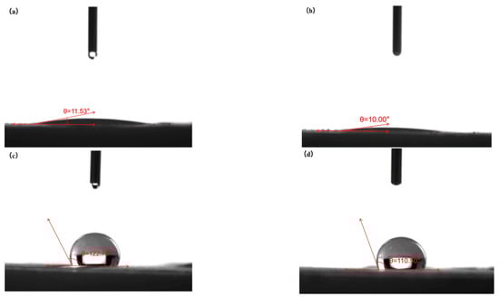 Contact angle of clay minerals in contact with water. (a) Unmodified kaolin; (b) unmodified illite; (c) modified kaolin; (d) modified illite.