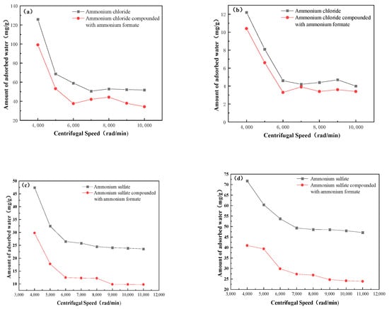 The relationship between the amount of adsorbed water on the clay mineral surface and the centrifugal speed was calculated and is shown in Figure 6. In comparison with clay minerals soaked in ammonium chloride and ammonium sulfate without ammonium formate, the adsorbed water on clay minerals soaked in ammonium salts with ammonium formate significantly decreases. The weight of adsorbed water gradually decreases with the increase in centrifugal speed and force. This suggests that ammonium formate can obviously reduce the adsorbed water on the clay mineral particle surface. Ammonium formate can reduce the amount of adsorbed water by weakening the force of electrostatic attraction or hydrogen bonding between clay mineral particles and water molecules.