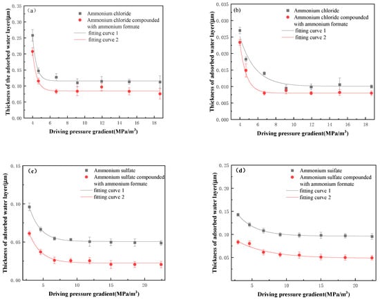 The above equations also show that the adsorbed water layer will gradually decrease with the increase in driving pressure until it reaches equilibrium, demonstrating the process of the adsorbed water layer gradually falling off under the influence of external forces. When the weight and the thickness of the water layer do not change, the water layer on the modified clay mineral particle surface is only composed of the retained water layer, so the calculated thickness of the water layer is the thickness of the adsorbed water layer. In the analysis of the thickness of adsorbed water layer under the action of various leaching solutions, the results show that ammonium formate effectively reduces the thickness of adsorbed water layer by 0.0501 μm and 0.0280 μm for kaolin in the ammonium chloride system and ammonium sulfate system, respectively, while for illite, the thickness of adsorbed water layer is reduced by 0.0020 μm and 0.0282 μm. The addition of ammonium formate significantly reduced the layer thickness on the clay mineral particle surface, effectively inhibiting hydration and increasing the seepage velocity.