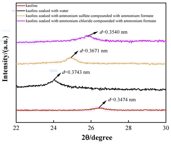 As seen in Equation (17), the smaller the diffraction angle is, the larger the interlayer spacing is. The interlayer spacing and d-spacing of different samples were calculated using Equation (17). Figure 8 shows that the interlayer spacing of kaolin is the smallest. After soaking in water, the diffraction peak angle moves to a lower angle, and the interlayer spacing increases to 0.3743 nm. After soaking in a compound solution of ammonium chloride and ammonium formate, the d-spacing of kaolin increases to 0.3540 nm. It increases to 0.3671 nm after soaking in a compound solution of ammonium sulfate and ammonium formate. Compared with soaking in water, the interlayer spacing of kaolin soaked in the compound solutions slightly decreased by 0.0203 nm and 0.0072 nm, respectively, indicating that the addition of ammonium formate made the interlayer spacing of kaolin thinner. The amount of absorbed water decreased due to the smaller interlayer spacing, thereby reducing the thickness of the adsorbed water layer.