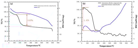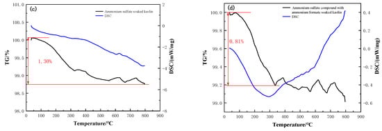 As seen in Figure 9, the TG curve of kaolin first shows a sharp decrease with the increase in temperature and then is flattened with the further increase in temperature to a certain level. The specific gravity of the ore sample gently decreases in the range of 30–150 °C and then sharply declines by 1.13% in the range of 150–250 °C. The DSC curve drops smoothly, indicating that the structure of kaolin has not changed at this time. The DSC curve of kaolin samples soaked in ammonium chloride and in ammonium chloride with ammonium formate were compared. The DSC curve of samples changed after the addition of ammonium formate; it began to rise at 265 °C, which means the changes in the structure happen due to the action of ammonium formate. As seen in Figure 9c, the specific gravity decreases by 1.30% in the range of 30–800 °C, and the DSC curve smoothly slides down, which means the kaolin structure does not change. Compared with the variation in the DSC curve shown in Figure 9c, the DSC curve in Figure 9d shows an obvious rise at 300 °C. Consequently, the addition of ammonium formate results in a reduction in the amount of adsorbed water and then is conducive to inhibiting the swelling of clay minerals.