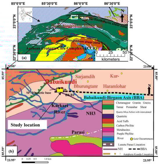 Globally, most gold deposits are confined to Archean greenstone belts within basic and ultrabasic rocks (komatiitic and tholeiitic). Apart from the lithological association, the regional and local geological settings control gold mineralization and their affiliation with higher-order structural zones, i.e., the shear zone is one of the most important attributes that controls the transportation of auriferous hydrothermal fluid from the deeper horizon to the near-surface P-T environment [1,2]. Although first-order crustal-scale shear zones are rarely auriferous, they release auriferous fluid into second-order (5–10 km) and, subsequently, third-order (1 km) shear/fracture zones [3]. The Singhbhum crustal province is a well-known cratonic belt that hosts several mineral deposits in the Eastern Indian Shield [3]. The North Singhbhum Mobile Belt (NSMB) (1.0–2.4 Ga) is situated between two crustal-scale shear zones: one is the South Purulia shear zone (SPSZ), which is located north of the NSMB, and another is the Singhbhum Shear Zone (SSZ), situated in the south of NSMB. The NSMB comprises metasedimentary and metaigneous rocks (low- to medium-grade), with multiphase folded layers of each lying within the North Singhbhum crustal province.