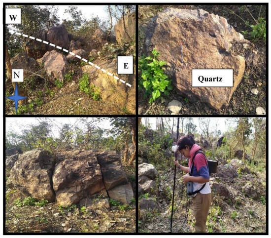 The Singhbhum crustal province is divided into the northern younger province, consisting of a Singhbhum Group metasedimentary sequence [17,18], and the southern, older Iron Ore Series (Banded Iron formations, BIFs). The 200 km long, E-W trending, metasedimentary sequence, also known as NSMB [16,19], is an arcuate belt exhibiting a complex interplay of tectonism and sedimentation. According to Misra and Johnson [20], and Mahato et al. [21], the belt witnessed several reactivation episodes during the Archean Era. The study area is located in the northern part of NSMB, covering a part of the Babaikundi–Birgaon Axis (Figure 1). The bedrock geology with quartz reef is exposed in some areas, whereas most is assumed to be buried under a regolith soil layer [16]. Gold/sulfide (orogenic) mineralization is mainly distributed among the area’s sheared quartz veins and reefs. Hematite, pyrrhotite, magnetite, pyrite, and chalcopyrite are common minerals often associated with gold mineralization. The lithology of the study area comprises metasedimentary and metavolcanic rocks such as quartz–muscovite–sericite schist, quartzite, phyllite, limonitic quartzite, amphibolite, and ultramafic rocks [19]. Evidence of shearing is observed throughout the field and hand specimens such as s-c fabric, boudinages, and elongated quartz veins. Concentric rings of goethite, sericite, and martite indicate chemical alteration in the area [16]. Multiple generations of quartz veins occurring throughout the lithology emphasize the hydrothermal reworking of the area. The hydrothermal deposition of gold shows extensive variations in the geological environment, and its existence ranges from thin quartz veins to disseminated anomalies.