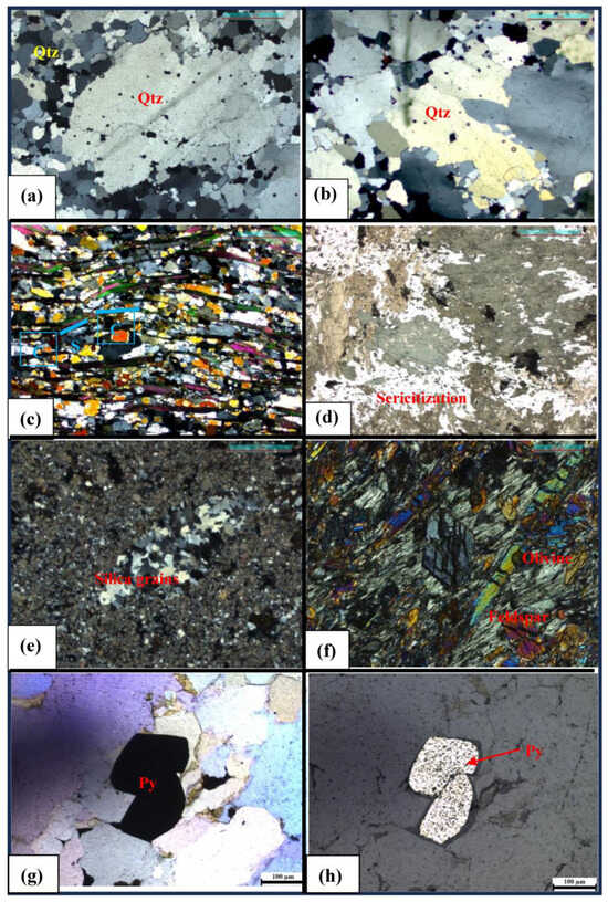 (a,b) Photomicrographs of quartz samples showing evidence of shearing with the presence of alternately arranged coarse- and fine-grained quartz (Qtz). (c) Photomicrograph of quartz mica schist exhibiting S-C fabric. (d) Effect of sericitization and chloritization within metavolcanic rocks. (e) Silicification within the metavolcanic rocks, which is associated with mineralization. (f) Photomicrograph of ultramafic rock. (g) Photomicrograph of pyrite grains in quartz reef under cross-polarized light. (h) Pyrite (Py) grains under reflected light.