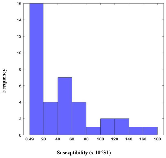 Histogram plot of susceptibility of rock samples collected in Babaikundi.