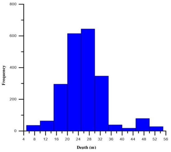 Three-dimensional Euler deconvolution was carried out for SI = 1, 2, 3 to estimate the solutions’ possible source geometry and clustering patterns. Figure 7 shows good clustering of the depth solutions with different colors on the map considering SI = 2, with a window size of 10 × 10 pixel square and depth tolerance of 10%, indicating a general geometry of a horizontal cylinder for the mineralized zone. The histogram of Euler depth solutions covering the study area shows that most solutions fall between 15 m and 35 m (Figure 8).