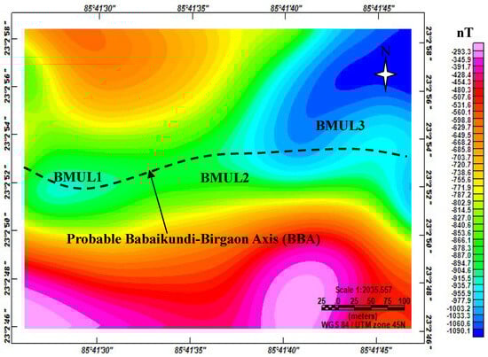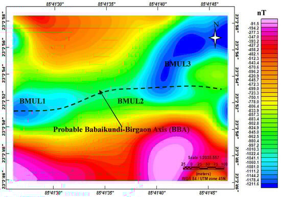 Upward continuation (30 m) anomaly map shows the possible extension of the Babaikundi–Birgaon Axis (BBA) with the low magnetic anomaly (BMUL1, BMUL2, BMUL3).