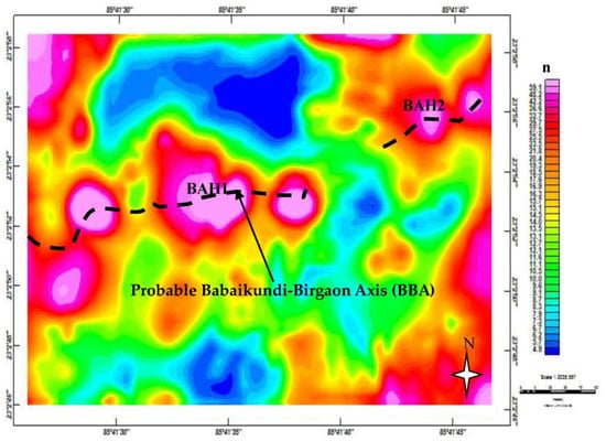 Upward continuations of the magnetic TMI data at 30 m and 60 m heights above the surface were carried out to remove possible high-frequency noises and understand deeper causative source trends (Figure 9 and Figure 10). Upward continuation of the magnetic TMI data at 30 m height (Figure 9) demarcates the shear zone with low magnetic anomalies from BMUL1, BMUL2, and BMUL3. As the continuation height increases, the effect of shallower features disappears [38]. Figure 10 reveals that the anomalies become smoother as the continuation height increases from 30 m to 60 m. The specified continuation height at 60 m signifies the region’s regional anomaly field (BMUL1 and BMUL2) from a depth below 30 m. Generally, upward-continued data exhibit responses from sources at depth > half the continuation height—this is a rule of thumb and applies only to layered sources [37]. The upward continuations of magnetic anomaly (Figure 9 and Figure 10) demonstrate the possible east–west shear zone extension with a prominent low magnetic anomaly value. The upward continuation map of 60 m (Figure 10) reveals the profoundly altered zone at a greater depth with a magnetic continued value of −1090.0 to −814.0 nT, signifying a prominent shear zone (BBA) in the area (Figure 10).