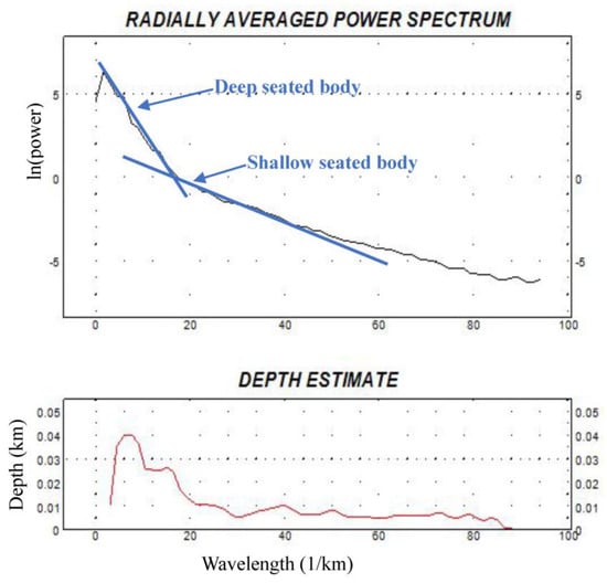 Plotting ln(p) against the wavenumber k and fitting a straight line, the slope of that line denoted by can be used to estimate source depths. The slopes determined at the higher and lower wavelengths provide depth estimates at shallower and deeper points, respectively. Oasis Montaj, Geosoft software was used for magnetic data analysis.