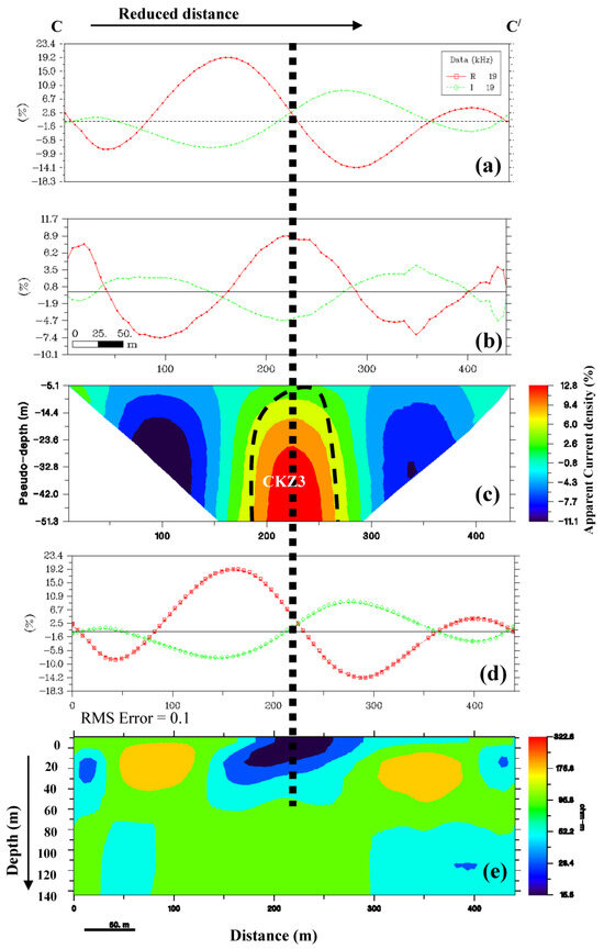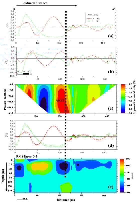 Figure 13a shows a plot of EMD-filtered data of A–A/, which shows a crossover of the real and imaginary VLF-EM data with zero axes at a reduced distance (RD) of ~230 m, indicating the possible location of an anomalous conducting feature/sulfide/gold body. The Fraser filter was applied on both in-phase and out-phase components, which shifts both components into a positive peak by 90 degrees at the same RD of ~230 m, indicating the subsurface conducting target (Figure 13b). The Karous–Hjelt (K–H) filter produces a 2D pseudo section of apparent current density, indicating a possible mineralized zone (AKZ1) with a high apparent current density value ranging from ~1.5 to 2.7% (Figure 13c). The VLF-EM data were inverted using the VLF2DMF program (EMTOMO) to generate an inverted 2D resistivity section [45,69,70,71]. The inverted 2D resistivity section demonstrates a low resistivity zone of ~ 50 Ωm, corresponding to the crossover of Figure 13a, with a root mean square (RMS) error of 0.4 (Figure 13d), indicating a possible mineralized zone (AKZ1) covering an RD of ~200 to 240 m at a depth of ~10 m to 45 m (Figure 13e).