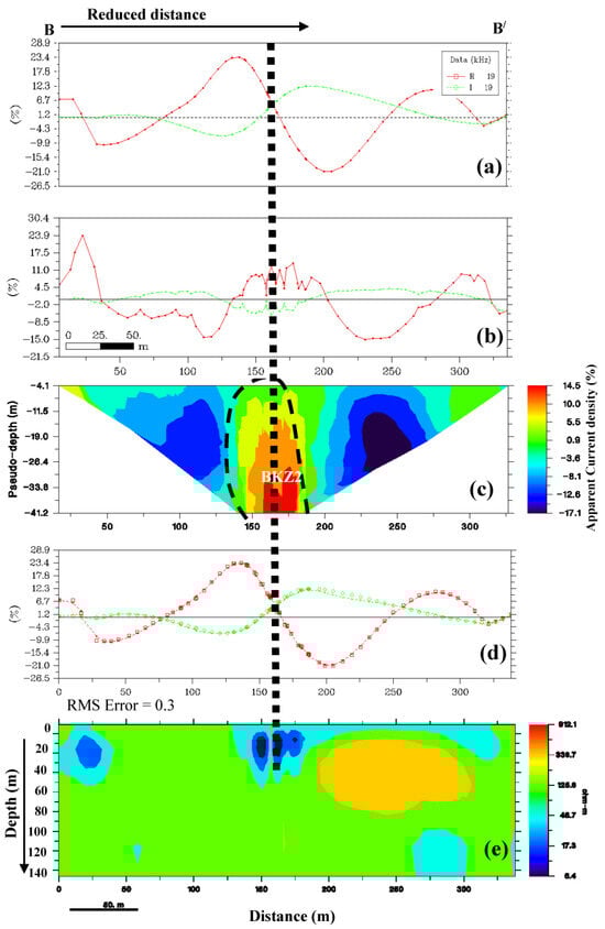 VLF data outputs along profile B–B/. (a) EMD-filtered plot with in-phase and out-phase components. (b) Fraser filter plot of in-phase and out-phase components. (c) K–H plot of in-phase component. (d) Data and model response curve. (e) 2D resistivity section after inversion of VLF-EM data. Black dotted line indicates the location of the anomalous conducting zone.