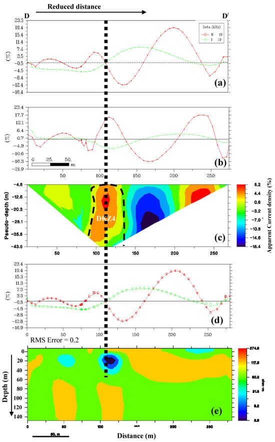 The profile D–D/ reveals the crossover point at an RD of ~110 m (Figure 16a), corresponding to a positive peak after applying the Fraser filter (Figure 16b), indicating a pseudo current density of ~4.4 to 8.2% (Figure 16c). The inverted 2D section of profile D–D/ with the RMS value of 0.2 (Figure 16d) demonstrates a low resistivity value of ~4 to 20 Ωm covering an RD of ~100 to 135 m at a depth of ~10 to 40 m (Figure 16e), possibly indicating an anomaly related to the mineralized body. Additional low-resistivity zones observed in Figure 13, Figure 14, Figure 15 and Figure 16 possibly indicate incorrect results because they are neither correlated with the crossover between the real and imaginary component of VLF-EM data nor with the high current density value that is essential to be considered as an anomalous conducting feature.