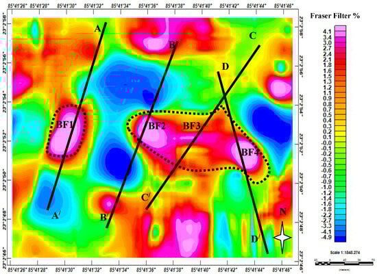 Fraser-filtered map of the in-phase component of profiles A–A/, B–B/, C–C/, and D–D/ in the study area. BF1, BF2, BF3, and BF4 represent zones of high Fraser-filtered in-phase value. The locations of four profiles, A–A/, B–B/, C–C/, and D–D/, of SP and VLF-EM are shown on the map.