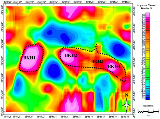 Similarly, the K–H in-phase data of the four profiles, A–A/, B–B/, C–C/, and D–D/, were also generated using VLF2DMF software to prepare a grid map to locate the high current density location [72,73,74,75]. The KH map shows the high current density value ranging from ~2.2 to 8%, delineated by BKH1, BKH2, BKH3, and BKH4 (Figure 18). The zones of high current density values were generated due to the presence of the secondary field, possibly indicating anomalous sulfide/gold-bearing mineralized zones in the subsurface.