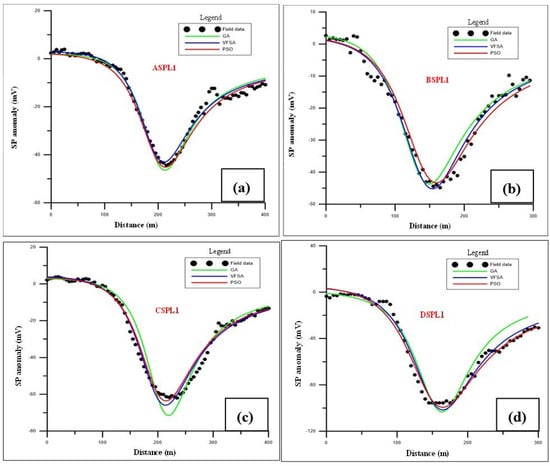 SP inversion was performed in four profiles, A–A/, B–B/, C–C/, and D–D/, using PSO, VFSA, and GA inversion techniques.