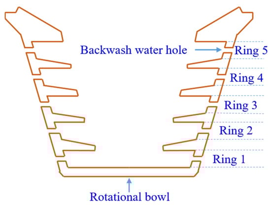 The classification test rig used in this investigation was the Knelson MD−3. The inverted and multi-hole KC bowl was mounted on a rotating shaft. As shown in Figure 1, there are five rings from the bottom to the top, with increasing diameters inside the bowl, and each ring has a number of 1 mm diameter tangentially oriented holes evenly spaced. The KC depends on an enhanced gravitational force, along with a fluidization process to recover fine particles. First, the backwash water is injected from the oriented holes in each ring. Then, the slurry is introduced into the rotational bowl from a feed pipe. Mineral particles of different densities are fluidized under the effect of backwash water and enhanced gravitational force, and, eventually, the denser particles settle in the ring, and the less dense mineral particles are flushed out to become tailings.