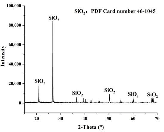 Single mineral particles such as quartz and magnetite are often used as raw materials for mineral separation experiments [11,26,27,31]. In this study, quartz powder (Xinyi silica Co., Ltd., Xinyi, China) and synthetic ore consisting of quartz and magnetite powder (Jinling iron ore mine, Zibo, China) with a mass ratio of 1:1 were used to mimic natural minerals with the same densities. The XRD pattern images in Figure 2 and Figure 3 show that the samples used for tests were predominantly quartz and magnetite with high purity. The size distributions of quartz and magnetite are shown in Table 1. The proportion of −500 μm particles in raw quartz was 96.71%, and most particles were concentrated below 400 μm, accounting for 89.98%. The percentage of −200 μm particles in raw magnetite was 92.93%, and it showed that the raw magnetite is finer than the raw quartz.