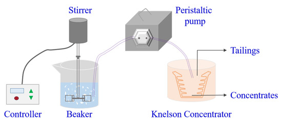 In most research, KCs were used to concentrate gold ores [23,24], synthetic ore [25,26], coal [27], nonmetallic minerals [28], jewelry wastes [29], etc. Xiao et al. modeled and predicted the gold recovery of a −800 μm gold deposit by using the Gravity Recoverable Gold (GRG) test [30]. Ghaffari et al. investigated the separation performance of the KC for −600 μm synthetic ore (quartz, magnetite, ferromolybdenum, copper, zinc, and lead) [31]. Özgen et al. used the KC to separate coal-washing-plant tailings of −500 μm and achieved a maximum combustible recovery of 81.61% [27]. Chen et al. studied the distribution of a quartz sample with a particle size range of −650 + 550 μm, −380 + 270 μm, −250 + 212 μm, and −180 + 150 μm in different rings in the bowl [32]. Burat et al. used the KC to separate jewelry wastes, which were crushed to −150 μm and recovered up to 92% of Au and Ag [29]. These findings suggested that mineral particle sizes were considered, indicating that mineral particle sizes were crucial to the gravity separation process. However, the classification closely related to mineral particle sizes had received little attention.