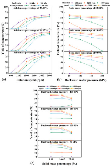 Yield of concentrate as a function of rotation speed (a), backwash water pressure (b), and solid mass percentage (c).