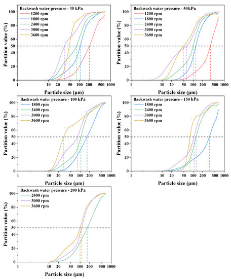 Similar to the solid mass percentage and rotation speed, the backwash water pressure also has a significant impact on the efficiency of quartz classification, and the partition curve also shows an S-shape (Figure 7). When lower rotation speeds are combined with higher backwash water pressures, for instance, 1200 rpm/150 kPa, 1200 rpm/200 kPa, and 1800 rpm/200 kPa, no effective classification occurs, thus leading to the majority of the feed quartz particles entering the tailings. Table 5 illustrates the evaluation indexes of the KC at different backwash water pressures for a solid mass percentage of 16.67% and a rotation speed of 1800 rpm. The backwash water pressure provides the driving force to form a particle fluidized bed, which helps the fine quartz particles to escape from the rings. However, when a larger backwash water pressure is employed, nearly all the feed quartz particles are washed out from the bowl, thus resulting in no effective classification. The d25, d50, d75, and d90 increase with the backwash water pressure. The I reached its minimum value of 0.37, while both SI and CE reach their maximum values of 0.50 and 89.59%, respectively, when the backwash water pressure was 50 kPa. These results indicate that the optimal quartz classification efficiency is achieved at a backwash water pressure of 50 kPa.