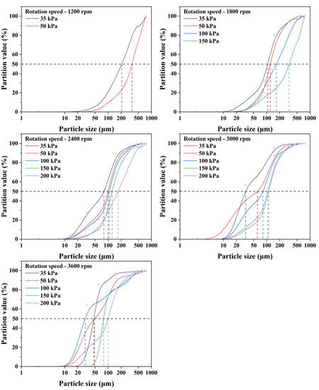 The partition curves of quartz at different rotation speeds and 16.67% solid mass percentage.