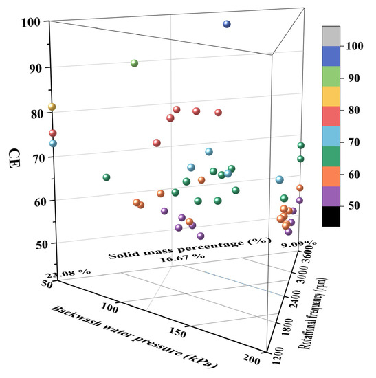 The CEs of 47 tests are plotted as a ternary phase diagram, as shown in Figure 8. Three parameters, namely the solid mass percentage, backwash water pressure, and rotation speed, form a triangle and are connected counterclockwise, and the values of them are successively distributed on the three sides, from small to large. Inside the triangle, three straight lines parallel to the sides of the triangle are made, and the intersection point and the corresponding point on the z-axis are the test variables and the corresponding CE. The values of the CE correspond to the right legend. The z-axis represents the CE, and the values of the CE correspond to the right legend. It can be seen from the Figure 8 that the CE values of all tests are greater than 50%. Particularly high CE values exceeding 70% are observed at a low solid mass percentage and backwash water pressure, as indicated by Figure 8. Specifically, the CE and cut size are 76.84% and 49 μm when the solid mass percentage is 16.67%, the backwash water pressure is 50 kPa, and the rotation speed is 3600 rpm.