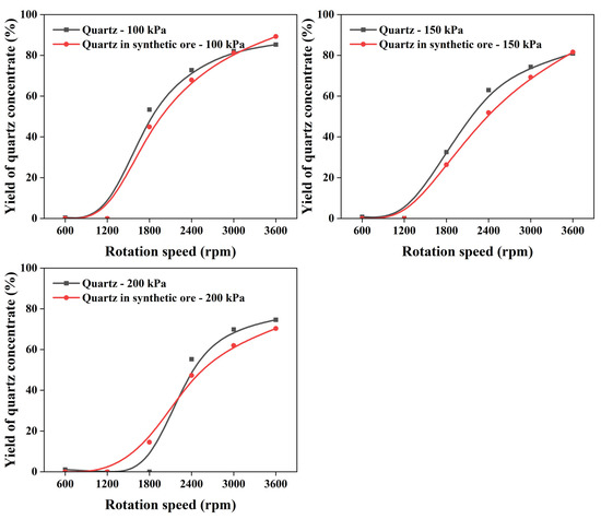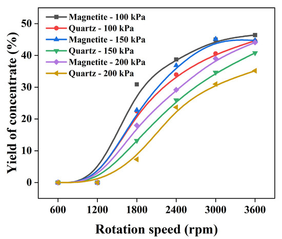 As can be seen from Figure 9, the yield of quartz concentrate in single quartz and synthetic ore tests increases with the rotation speed at the same backwash water pressure. The yield of single quartz is larger than that of quartz in synthetic ore, and the differences between them gradually increase with the increase in the rotation speed. These findings suggest that the magnetite in synthetic ore impacted the quartz classification process. The yield of magnetite in synthetic ore increases with the increase in the rotation speed and decreases with the increase in the backwash water pressure, as shown in Figure 10.