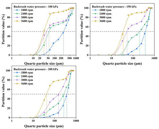 The partition curves of quartz at different backwash water pressures and 16.67% solid mass percentage.