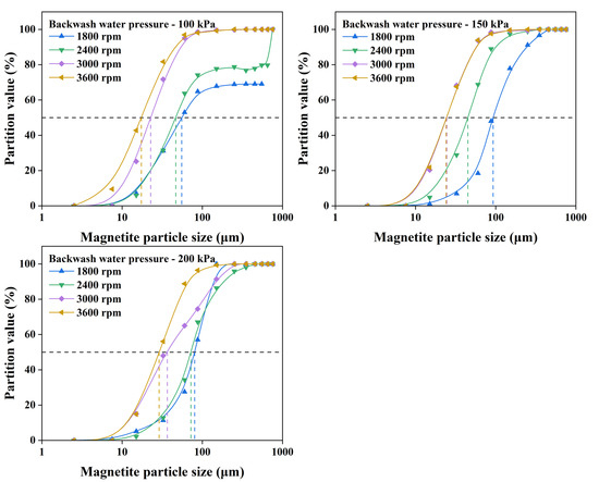 The presented classification size tends to decrease and increase as the rotation speed and backwash water pressure increases, respectively, and the CE ranges from 46.64% to 87.46%, as shown in Table 8. As the density of magnetite is greater than that of quartz and the size of magnetite is smaller than quartz, the d25, d50, d75, and d90 of magnetite are smaller than that of quartz. For example, at a backwash water pressure of 150 kPa and a rotation speed of 1800 rpm, the cut sizes of quartz and magnetite are 330 μm and 92 μm, respectively, and the CEs of quartz and magnetite are 71.68% and 87.46%, respectively. The magnetite exhibits a better classification efficiency than the quartz with the same combination of test parameters.