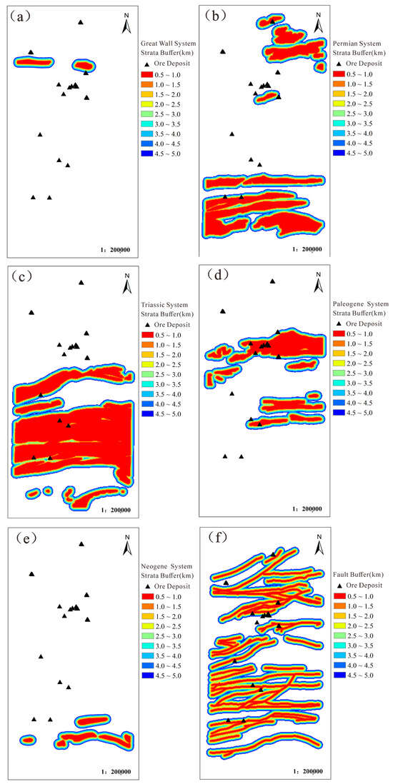 According to the geochemical characteristics of the geological units in 4.1, it is concluded that the Great Wall system, Permian system, Triassic system, Paleogene system, and Neogene system are the strata closely related to mineralization in the study area. The known ore spots also correspond well with these strata, so these five strata are selected, respectively, and a multi-ring buffer zone with a distance of 500 m and 10 rings is established (Figure 2).