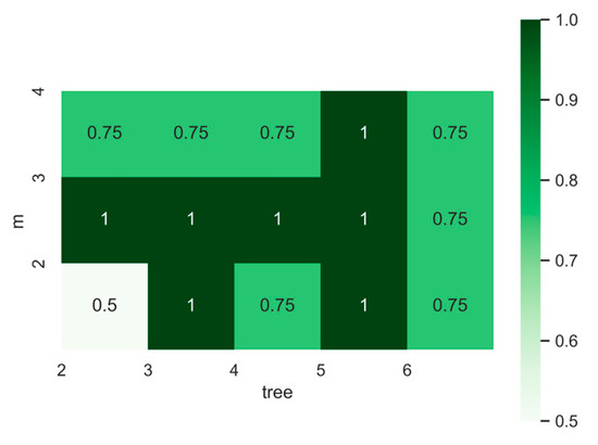 Unlike most machine learning methods, the random forest generation prediction model only needs to set two important parameters: the number of decision trees (trees) and the number of evidence features that each node uses to make the decision tree grow (m). Breiman [42] proved that with the increase in trees, the generalization error is always convergent, and there is no overfitting problem in overtraining. On the other hand, reducing the number of m will lead to a decrease in the correlation between trees, thereby improving the accuracy of the model. To optimize these parameters, a large number of experiments were carried out using different numbers of trees and feature numbers. The value range of trees was set to 2 to 6, and the interval was 1. The number of feature variables m was 2, 3, and 4, respectively. The results show (Figure 4, Table 4) that the average RF accuracy is 0.85, the standard deviation is 0.16, and it has high accuracy and stability. It can be seen that RF is less sensitive to parameter changes. The stable performance of RF is mainly attributed to the combination of multiple classifiers trained under certain conditions. On the one hand, the evidence features used for tree induction are randomly selected, which reduces the correlation between individual models, reduces the generalization error, and provides a very stable prediction. In addition, the feature selection method adds a re-sampling (Bagging) of the training data for each tree, which helps to increase the diversity of the models that make up the whole and prevents the decision tree from overfitting the data.