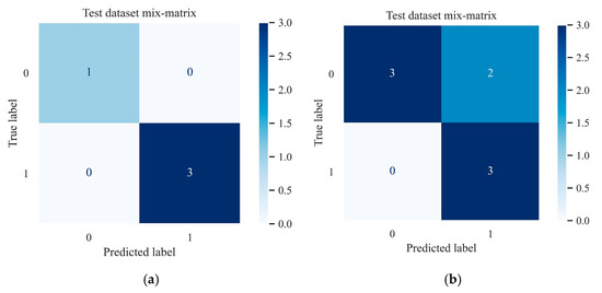 Random undersampling is used to sample the unbalanced data (27 ore spots and 10 non-ore spots) of the training dataset to ensure that the data ratio of 0 and 1 in the new dataset is approximately 1:1. Then, the newly generated data is trained and predicted by the hold-out method (80% training and 20% test), and the final prediction results are integrated. For the divided training dataset and prediction dataset, 15 parallel experiments were carried out by Tree taking 2–6, m taking 2, 3, and 4, and the best results were taken. Figure 5 lists the confusion matrix of the test set prediction of the random forest model under different sampling methods. It can be seen that the number of positive and negative samples of the correct classification is far greater than the number of samples of the wrong classification, and the model application is feasible. Based on this confusion matrix, the calculated evaluation parameters are shown in Table 5 (see Equations (3)–(6) for the calculation method). The random forest model shows different performances with different sampling methods.