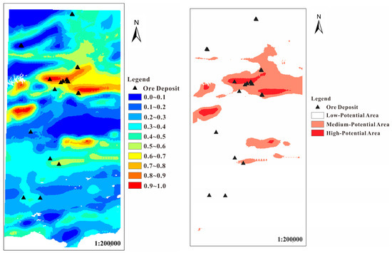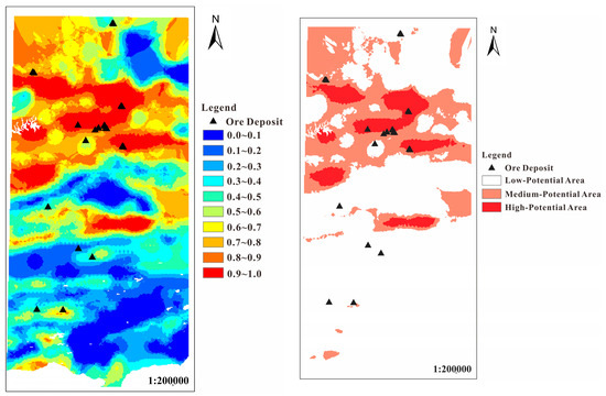 Figure 7 and Figure 8 show the prospect map of random forest metallogenic prediction under the training of integrated random undersampling and representative sample selection, respectively. The predicted value of each point is expressed by a 0–1 floating point value, which indicates the metallogenic probability value at this point. The regions with probabilities greater than 0.5 and 0.8 are extracted as delineated mineralization potential zones and high-potential zones, while regions below 0.5 are considered low-potential zones.