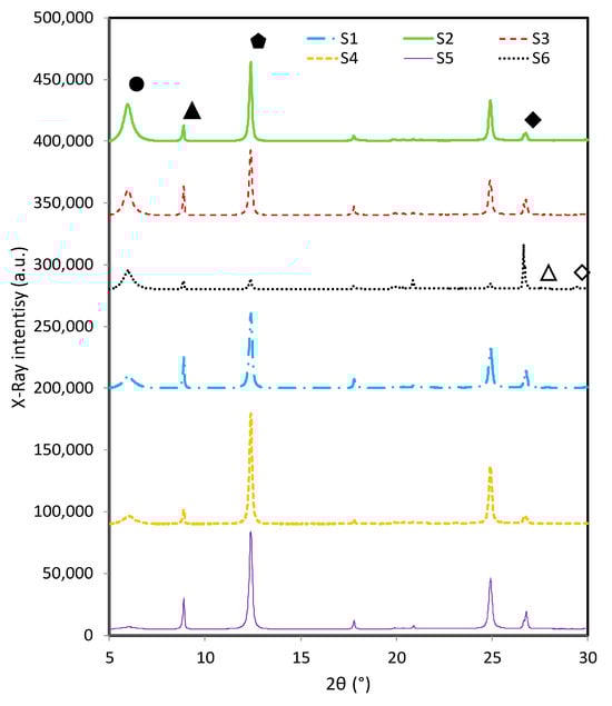 The studied montmorillonites presented a combination of calcium and sodium cations bound to the three-layer structure of the silico-aluminate to compensate their anionic character. This kind of mixing cations is the most typical combination observed in ceramic raw materials [35,36]. Even the last sample, S6, which presents a lower crystallite size, has adapted perfectly well to the proposed formula. Consequently, it can be considered a partially degraded montmorillonite but not a different one in composition, which would explain the lower crystallite size.
