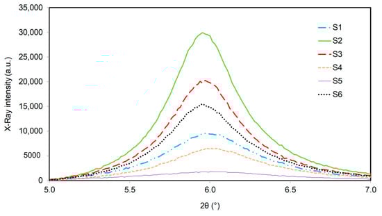 X-ray diffraction patterns for the six selected samples, 5–7° 2θ.