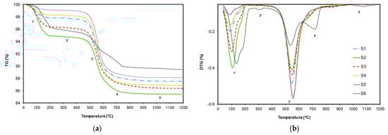 Thermal tests were carried out following the previously mentioned drying protocol to calculate the molecular formula, including the hydration water. Figure 3 shows the thermogravimetric test for the six samples involved in the study [15,34], showing significative differences among them in terms of water losses with temperature. A progressive evolution between samples 1 and 5 seems to be observed, but sample 6 follows its own trend. According to the different temperature range observed in the studied ceramic samples, the range 25–250 °C (1′) is related to hydration losses, range 250–350 °C (2′) is linked to hydroxide decomposition, range 350–650 °C (3′) shows the dehydroxylation processes from montmorillonites and kaolinite, range 650–900 °C (4′) introduces carbonates’ decomposition, and the final range of 900–1200 °C (5′) is related to sulphates’ decomposition.