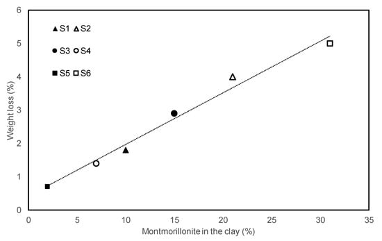However, it should be noted that the obtained trend shows a progressive reduction in the slope as the percentage of montmorillonite in the sample increases, for which small differences in hydration loss could cause high differences in the percentage of smectites quantified. S6 seems to lightly deviate from the linear trend between montmorillonite content and weight loss. Therefore, for very high montmorillonite percentages, the results obtained with the loss in the ignition test should be taken with certain reservations. This fact has been checked during the validation of the protocol in the last section of the study.