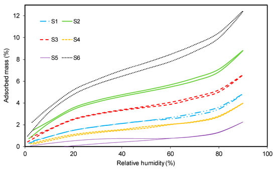 Figure 5 shows different sample behavior regarding the water vapor sorption depending on the relative humidity of the analyzing chamber. According to results, S6 is the one that has the higher sorption capacity and S5 has the lowest. After observing different sorption capacities among samples, a certain relationship between the adsorption of water and the presence of montmorillonite in the raw material has tried to be established.