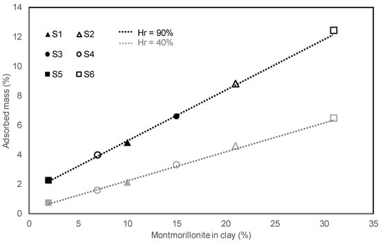 Relationship between water vapor adsorption and montmorillonite content in studied clays at relative humidity 90% (black) and relative humidity 40% (grey).