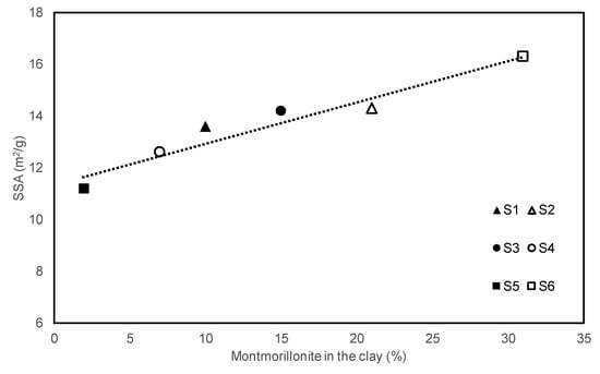Relationship between specific surface area and montmorillonite content in studied clays.