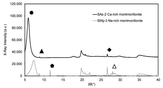X-ray diffraction patterns obtained for reference samples SAz-2 and SWy-3: ● montmo-rillonite, ▲ illite/mica muscovite,