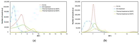 Figure 9 shows the evolution of both the reference materials after carrying out the different treatments during the oriented aggregate method. Calcium-rich montmorillonite presents a higher deformation of d-spacing than the sodium-rich montmorillonite, indicating their specific structure, depending on the cations that substitute the interlayer spaces.