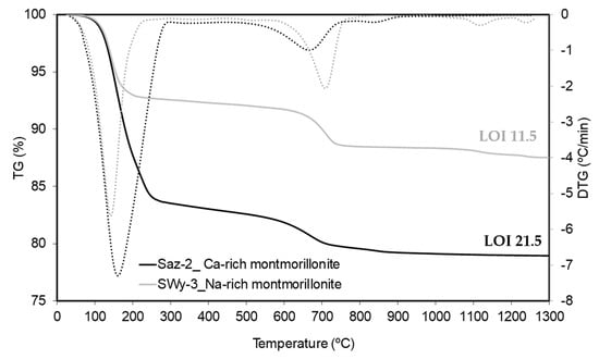 Figure 10 shows results obtained after carrying out the thermogravimetrically analysis on both samples. It was observed that the theoretical (Table 2) and experimental data regarding LOI are not perfectly correlated. This phenomenon could be directly associated with the effect of sample preparation and moisture removal. If the reference samples had been dried at 110 °C, the LOI values would have practically matched the theoretical values obtained from the certificate. Nevertheless, with the intention of calculating the hydration water to obtain the whole formula of the montmorillonite, samples were dried at 60 °C for two hours before carrying out the TG-DTG test. This is the reason why the water losses do not match the ones obtained in the chemical analysis.